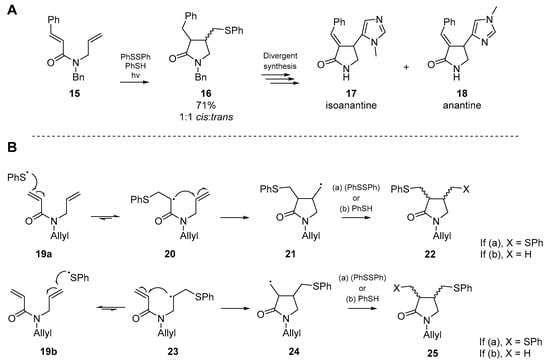 Shortly thereafter, a significant advancement in the application of thiyl radical initiated cascades was published by Naito et al. []. In a publication focused on the total synthesis of two imidazole alkaloids, Naito and co-workers employed the thiyl radical addition/cyclization cascade of an N-allyl-N-benzylcinnamamide 15 with diphenyl disulfide and thiophenol in equimolar quantities, which under photochemical irradiation cyclized to the desired 3,4-disubstituted pyrrolidinone 16, albeit as a racemic mixture. This afforded the necessary building block to complete their synthesis of isoanatine 17 and anantine 18 (Scheme 4A) []. Just two years later, Naito et al. expanded upon the utility of this reaction, in part one of a series on radical cyclization in heterocycle synthesis []. Through application of the methodology developed for their previous alkaloid synthesis, Naito and co-workers developed a new synthetic method which furnished nitrogen-containing heterocycles from simple dienylamide starting materials. This addition generates either one or two carbon-sulfur bonds, and the desired carbon-carbon bond. The authors sought to establish the regiochemistry of thiyl radical addition, the cyclization mode (i.e., 5-exo-trig vs. 6-endo-trig) and finally, whether any stereochemical control was exerted by the process. By using a substrate with two different types of olefins, an insight into the chemoselectivity was also recorded.