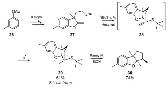 Shortly before the turn of the millennium, another example highlighting the efficacy of the thiyl radical addition/cyclization process emerged from Harrowven and collaborators []. In the course of their work in the terpenoid field, the authors took advantage of a sulfur mediated radical cyclization strategy to complete the total syntheses of aplysin and debromoaplysin. Through clever retrosynthetic analysis, Harrowven et al. identified that a 5-exo-trig cyclization through a chair-like transition state would simultaneously furnish both the sterically demanding tricyclic backbone of aplysin, and generate the relative stereochemical configuration for three neighboring stereogenic centers. Employing a Raney nickel desulfurization strategy, Harrowven et al. obtained the necessary skeleton 29 in a diastereomeric ratio of 8:1 (Scheme 5). Similar to the previously discussed strategy employed by Kuehne et al., the use of thiyl radicals offers a much cheaper and less toxic alternative to the archetypal organotin based radical methods.