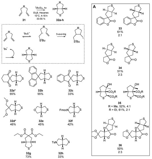 - Harrowven, D.C.; Hannam, J.C.; Lucas, M.C.; Newman, N.A.; Howes, P.D. A thiyl radical mediated cascade sequence for the co-cyclisation of 1,6-hexadienes with sulfur atom transfer. Tetrahedron Lett. 2000, 41, 9345–9349. [Google Scholar] [CrossRef]