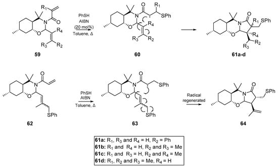 Pedrosa et al. [] shortly thereafter reported on the carbocyclizations of perhydro-1,3-benzoxazines, furnishing 3,4-disubtitued pyrrolidinone derivatives with good diastereoselectivity and complete regioselectivity. A wide array of substituted products were synthesized, and substitution at both olefin termini was well tolerated. The author’s results further supported the findings of Miyata et al. [], in that a phenyl thioether 62 suitably disposed to radical elimination can generate secondary olefins 64 as a result of the carbocyclization process (Scheme 10). The preference of the thiyl radical SOMO to interact with electron deficient alkenes was also exploited, with the nascent phenythiyl radical attacking the acrylic olefin before cyclizing through the expected 5-exo-trig pathway onto the substituted alkene.