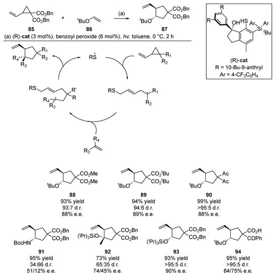 An example which highlights the significant potential of the thiyl radical addition/cyclization in diene cascade reactions comes from Hashimoto et al. []. This publication from the Maruoka group details an organic thiyl radical catalyst for enantioselective cyclization (Scheme 14). Through the careful design of a chiral pocket around the chiral thiol precatalyst, the authors were able to exact an enantio- and diastereoselective C-C bond forming cyclization with concomitant extrusion of the thiyl radical at the end of the cascade. With 3 mol% loading of a binaphthyl-modified catalyst and benzoyl peroxide to generate the thiyl radical, a wide array of substrates were successfully cyclized by this catalyst, in yields up to 99% and diastereomeric rations of up to 95:5. Indeed the catalyst loading could be scaled as low as 1 mol% at larger scales (1 mmol) []. In their studies to optimize catalyst structure, Hashimoto et al. were able to attain yields of up to 95%, with a diastereomeric ratio (d.r.) of 95:5 and enantiomeric excess (e.e.) of 86% using sunlight as the photolysis source. Hashimoto et al. continued to develop this methodology, and in 2016 published a communication on the use of bulky thiyl radical catalysts for [3 + 2] cyclizations, this time with N-tosylvinylaziridines and alkenes [].