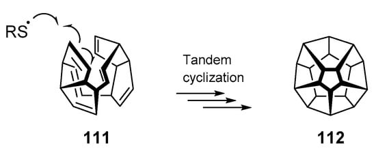 Thus far, this review has shown numerous examples that have employed the thiyl radical addition/cyclization cascade for a variety of substrates. But what are the limitations of the process? A 2017 publication [] by Wang and colleagues poses an interesting question—is it possible that radical polycyclization could yield dodecahedrane 112, one of the top synthetic targets sought by organic chemists for decades []? Woodward failed in synthesizing this Platonic hydrocarbon [,], but the Paquette group succeeded the first synthesis in the early 1980s []. The account by Wang et al. assesses the viability of thiyl radicals as mediators of polycyclizations to construct complex molecular architectures (Scheme 17). Using density functional theory (DFT) calculations, the authors concluded that the process is energetically viable in both a kinetic and thermodynamic sense. While the reversibility of the thiol-ene and potential quenching by hydrogen atom transfer were highlighted, the quantum chemical calculations indicate the possibility that one day, these complex geometries may be obtained using simple thiyl radical cascades.