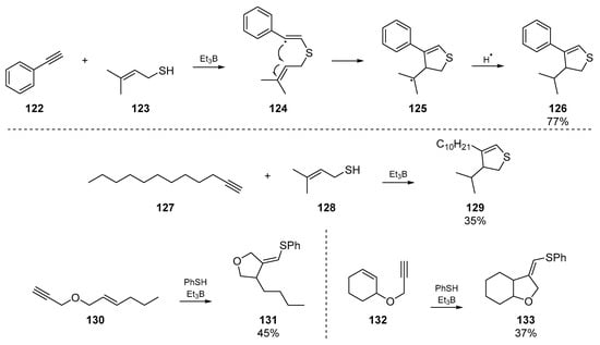Ichinose et al. reported an account of triethylborane based radical initiation for addition to acetylenic compounds. The authors explored addition of thiyl groups to terminal acetylene compounds [], which proceeded regioselectively but not stereoselectively (Scheme 19). The three examples of interest to this review are that of an intermolecular dihydrothiophene synthesis 129, and the vinyl radical cyclization of two acetylenic olefins 130 and 132. Analogous to the work carried out by Broka et al. in the same year, a clear trend in the substitution and steric demands around the olefin was identified.
