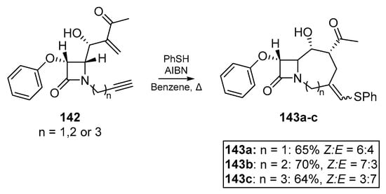 In an account by Alcaide et al., an early medicinal chemistry application of the thiyl radical addition/cyclization cascade is described []. Highly functionalized rings fused to a common pharmacophore, a β-lactam, were synthesized via radical cascade chemistry on a number of Baylis-Hillman adducts, providing the basis for this stereocontrolled and chemoselective approach shown in Scheme 21. Several phenylthiovinyl derivatives 143a–c of the yne-ene based β-lactams 142 were obtained, and subject to further transformation. It should be noted that in the case of n = 4 i.e., the 5-hexynyl conjugated β-lactam, neither the thiyl radical addition nor classical methods such as organotin chemistry could cyclize the substrate. It is also noteworthy that it was possible for the authors to initiate thiyl-yne conjugation prior to the Michael addition, which one would expect to compete for the thiol via thia-Michael addition.