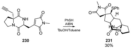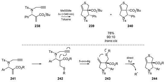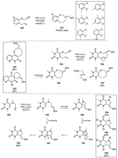 Thiyl radicals are well known to react efficiently at sites of unsaturation, through the thiol-ene and thiol-yne reactions. A full analysis of the utility of these reactions is beyond the scope of this review, and readers are directed to the reviews already present in the literature [,,,,,,]. This account will focus exclusively on the intramolecular trapping of the nascent carbon radical formed via thiyl radical addition, and how these radicals form rings and products in cascade reactions.