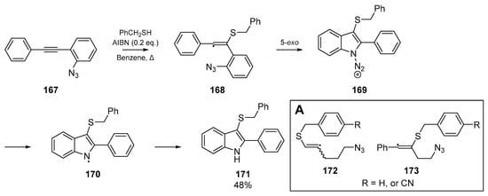 Montevecchi et al. detailed the addition of thiyl radicals to alkynyl azides [] as well as attempted cyclizations onto carbonyls and cyano groups []. The group continued to explore these processes, and also published on the relative reaction rates of thiyl radical addition and hydrogen atom abstraction []. In their investigation of alkynyl azides as suitable substrates for thiyl radical mediated cyclization, the authors identified two suitable 2-sulfanylvinyl radicals which underwent 5-exo cyclization onto the azido moiety, preventing intramolecular addition to the sulfanyl aromatic ring (Scheme 24). In the course of this project, Montevecchi and co-workers rationalized the ability of these two radicals to cyclize by considering the resonance stabilization of the nascent triazenyl radicals, caused by delocalization into the indole ring. They also reasoned that the failure of other radicals to undergo cyclization may be explained by unfavorable polar effects in the transitions state between the more electrophilic vinyl radicals and the aliphatic azido moiety. Note that while benzyl mercaptan is shown as the thiol agent in Scheme 24, similar success was observed with thiophenol as the thiyl radical precursor.