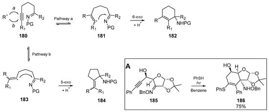 Fernández et al. published a one-step cyclization of ketimines into cyclized allylamine derivatives in the mid-2000s, which again relies upon a tandem radical addition/cyclization strategy (Scheme 26) []. Using a substrate inspired by the research group’s interest in tetrodotoxin, a number of thiyl radical mediated cyclizations were attempted. The authors sought to exert control over cyclization through the 6-endo versus the 5-exo mode. Indeed by substitution the alkyne terminus with a phenyl group 185 restored some control over the cyclization mode, and through using the traditional PhSH/AIBN couple, a number of conditions were explored. Interestingly, the use of a medium pressure mercury lamp as the irradiation source permitted the use of just 1.05 equivalents of thiophenol and no AIBN was required; these conditions gave the highest cyclization yield of 75%. However this success was reliant on the alkynyl substituent being a phenyl group, as esters and ethers did not promote formation of the desired cyclohexeynlamine 186.