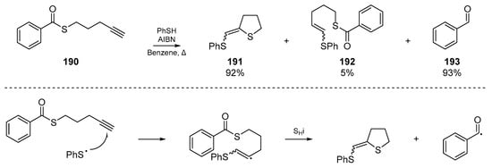 Previously discussed work by Padwa et al. has shown that a sulfur atom suitably disposed to undergo SHi can extrude an acyl radical under the appropriate conditions. Almost twenty years after this account, Benati and co-workers exploited this methodology for the production of aldehydes under tin and silicon free conditions (Scheme 28) []. Benati’s radical cascade reaction between thiophenol and pentynylthiol esters 190 provides both aromatic and aliphatic aldehydes, and permits a formal reduction of esters to aldehydes even with substituents which would normally be very sensitive to any reducing conditions. The formation of concomitant dihydrothiophenes 191 frames this account as relevant to the present review, and offers a useful synthetic route to this sulfur-based heterocycle; albeit with a lack of diastereoselectivity.