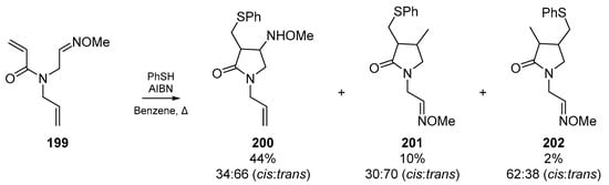 Broadening the scope of the review to consider ‘mixed’ unsaturated systems, the inclusion of unsaturation at heteroatomic moieties must also be considered. A very early example form El Kaim et al. [] offers 5- and 6-exo-trig cyclizations of oxime ethers and hydrazones. By generating thiyl radicals from thiophenol, a number of ethylenic and acetylenic hydrazones were cyclized under thermal initiation with AIBN in refluxing cyclohexane (Scheme 20). Analogous to early work by Padwa et al. previously discussed, the cis isomer predominates in the cyclization, despite the inclusion of heteroatoms. Furthermore, no trace of uncyclized product was detected for the conditions reported herein. The methodology published in this account widened the scope for cyclizations on the C=N bond, and general examples from this work are detailed below to show the range of functional group tolerance. Despite this clear forbearance to varying functionality, example 138 did not cyclize.