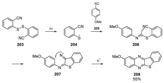 - Camaggi, C.M.; Leardini, R.; Nanni, D.; Zanardi, G. Radical annulations with nitriles: Novel cascade reactions of cyano-substituted alkyl and sulfanyl radicals with isonitriles. Tetrahedron 1998, 54, 5587–5598. [Google Scholar] [CrossRef]