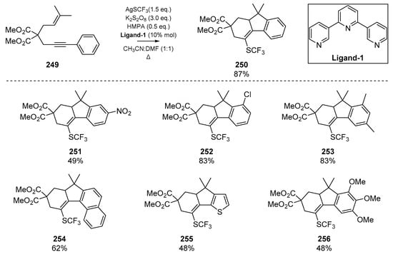 - Qiu, Y.F.; Zhu, X.Y.; Li, Y.X.; He, Y.T.; Yang, F.; Wang, J.; Hua, H.L.; Zheng, L.; Wang, L.C.; Liu, X.Y.; et al. AgSCF3-Mediated Trifluoromethylthiolation/Radical Cascade Cyclization of 1,6-Enynes. Org. Lett. 2015, 17, 3694–3697. [Google Scholar] [CrossRef]