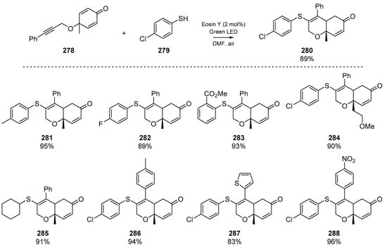 - Nair, A.M.; Kumar, S.; Volla, C.M.R. Visible Light Mediated Sulfenylation-Annulation Cascade of Alkyne Tethered Cyclohexadienones. Adv. Synth. Catal. 2019, 361, 4983–4988. [Google Scholar] [CrossRef]