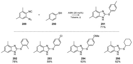 - Li, D.; Lei, J. Thio radical-induced denitrogenative annulation of 1-azido-2-isocyanoarenes to construct 2-thiolated benzimidazoles. Org. Biomol. Chem. 2019, 17, 9666–9671. [Google Scholar] [CrossRef]