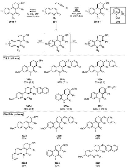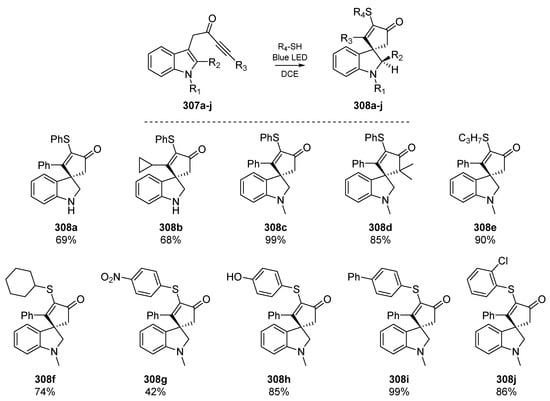 - Mallick, R.K.; Dutta, S.; Vanjari, R.; Voituriez, A.; Sahoo, A.K. Thioarylative Radical Cyclization of Yne-Dienone. J. Org. Chem. 2019, 84, 10509–10517. [Google Scholar] [CrossRef]