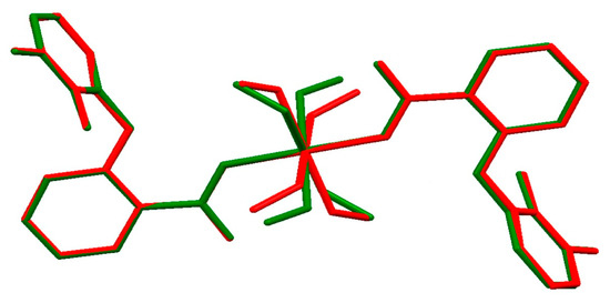 Superposition of structures 3 (red) and 4 (green). Hydrogen atoms and methanol O5 molecules in the outer coordination sphere are omitted for clarity.