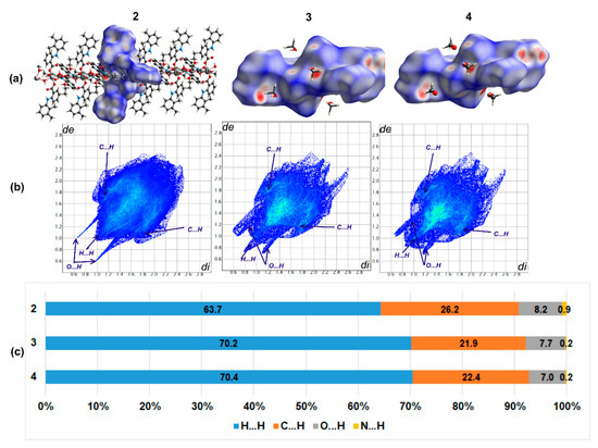 (a) Hirshfeld surfaces generated for the mer unit of 2 and the single molecules of 3 and 4. (b) Fingerprint plots generated for respective moieties. Labels indicate regions of specific interatomic interactions. (c) The percentage contributions to the Hirshfeld surface areas for intermolecular contacts.