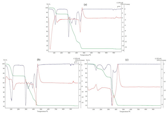 Thermoanalytical curves for 2 (a), 3 (b), and 4 (c). TG is plotted in green, DTG is in blue, while DTA is in red.