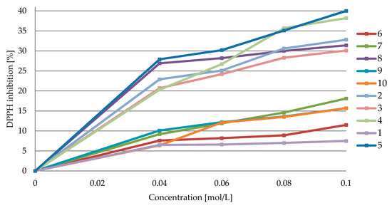 The investigated complexes exhibited visible RSAs (i.e., higher than that of 1), with those of 5, 4, 2, and 8 being the highest. The final antioxidant activities are in the order of 5 > 4 > 2 > 8 > 3 > 7 > 9 > 10 > 6 (Figure 6). Similar results were reported by Altun and Suözer [45], who pointed out that the electron withdrawing effect of the metal(II) ion facilitates the release of hydrogen, which further reduces the DPPH radical.