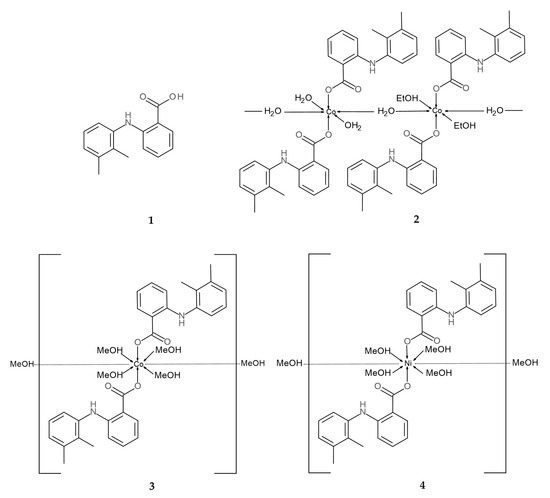 Additionally, a number of crystal structures of metal–mefenamato complexes have been reported. In particular, a series of Mn(II) [3,32], Co(II) [33], Ni(II) [34], Cu(II) [35,36,37], Zn(II) [38], and Sn(IV) [39] complexes showed that mefenamato ligands may be involved in diverse coordination modes.