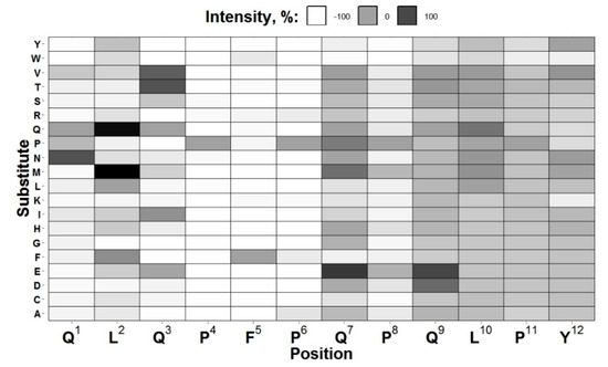 As a result, we found that the best signal-to-noise ratio was obtained for the X6/X6-HRP pair and conducted further studies only with this antibody. Based on the amino acid structure, we found that both peptides contain a repeating fragment—QPFPQ. Therefore, we can suggest that it is part of the epitope. For the subsequent peptide mapping, we selected a shorter peptide containing the indicated fragment—QLQPFPQPQLPY. Introducing amino acid substitutions in each of the 12 positions resulted in the chip containing the formed peptides (n = 720). The reactivity of X6 antibody with the obtained set of peptides is presented in Figure 1.