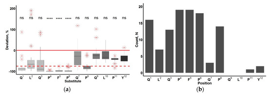 Quantitative change in the binding of an antibody to the QLQPFPQPQLPY peptide upon introduction of amino acid substitutions. (a) percent deviation of affinity from the original peptide; outliers are marked with a red asterisk, Mann–Whitney test significance levels are black: ns: p > 0.05; ****: p ≤ 0.0001; (b) number of amino acid substitution variants in the peptide, leading to a 75% decrease in the affinity of the antibody to it.