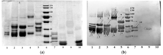 Electrophoresis of various prolamins (a) 1—Triticum urartu, 2—Triticum turgidum, 3—Triticum aestivum, 4—Secale cereale, 5—Hordeum vulgare, 6—molecular weight marker, kDa, 7—Avena sativa, 8—Zea mays, 9—Dasypyrum villosum, 10—Setaria italica; (b) western blotting of X6. Lines indicate the bands analyzed by MALDI-TOF, the results of which are shown in Table 4.