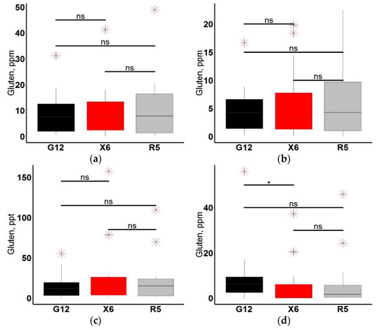Gluten content in various groups of products: (a) bakery (n = 16), (b) flour (n = 16), (c) high–gluten products (n = 12), (d) snack (n = 18). Outliers are marked with a red asterisk, Mann–Whitney test significance levels are black: ns: p > 0.05; *: p ≤ 0.025.