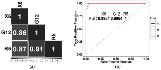 Gluten content comparison results obtained using various methods: (a) correlogram obtained by analyzing the gluten content using various test systems. The squares indicate the value of the Pearson correlation coefficient; (b) ROC curves obtained from the analysis of products using various ELISA.