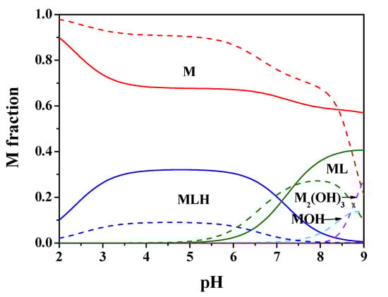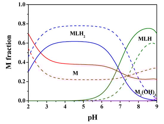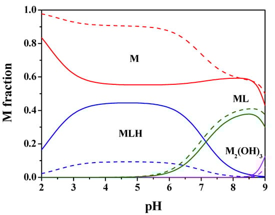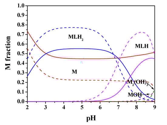 Figure 2 shows the speciation diagram for this system at t = 25 °C, CM = 2 mmol L−1, CL = 4 mmol L−1, I = 0.15 mol L−1 in NaCl. It can be observed from the diagram that the MLH species is present in a wide pH range with metal fraction greater than 0.4, the ML one reaches almost 0.4 as a fraction at pH = 8.5. The M2(OH)3 hydrolytic species is significant only starting from pH > 9.
