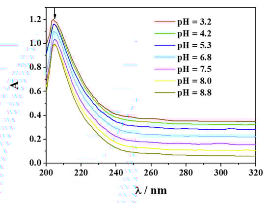 As for Amp, the system containing Mn2+-Amox has been investigated with potentiometry as well as with UV spectrophotometry. Experimental UV spectra at different pH values recorded on solutions containing Mn2+(M) and Amox(L) are shown in Figure 6 (CM = 0.05 mmol L−1, CL = 0.075 mmol L−1, t = 25 °C, I = 0.15 mol L−1 in NaCl). As known, spectra of solutions containing Amox result more complex than those containing Amp. In the range λ = 220–310 nm the former present intense bands, as expected for ligands having heteroatoms, linked to benzene ring, giving electronic transfer phenomena. Accordingly, the observed absorptions are typical of aromatic compounds with polar substituents, such as phenolic groups, characterized by charge transfer with ε = 5 × 103–16 × 103 L mol−1 cm−1 in the range mentioned above.