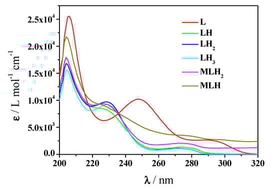 These absorption maxima show different trends with increasing pH, the maxima at about 204 and 272 nm undergo a hyperchromic effect, on the contrary the maximum at 229 nm has a hypochromic effect. Molar absorbances of Mn2+-Amox species as well as those of Amox are depicted in Figure 7. More in detail, at λ = 207 nm, fully deprotonated ligand species has ε ≅ 27 × 103 L mol−1 cm−1, followed by MLH and MLH2 with ε ≅ 21 × 103, 18 × 103 L mol−1 cm−1, respectively at λ = 204 nm. At λ = 229 nm, only ligand protonated species and complex ones present a maximum. LH2 species shows ε ≅ 1 × 103 L mol−1 cm−1 at 229 nm, the interaction with metal causes a slight shift of the maximum. Accordingly, MLH2 and MLH present a maximum at 228 nm with ε ≅ 9 × 103.