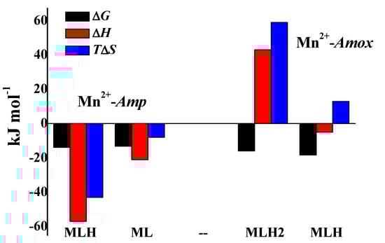 Bar plot of ΔG, ΔH, TΔS referring to the Mn2+-Amp and Mn2+-Amox systems at t = 25 °C, I = 0.15 mol L−1 in NaCl, according to the reaction (2).