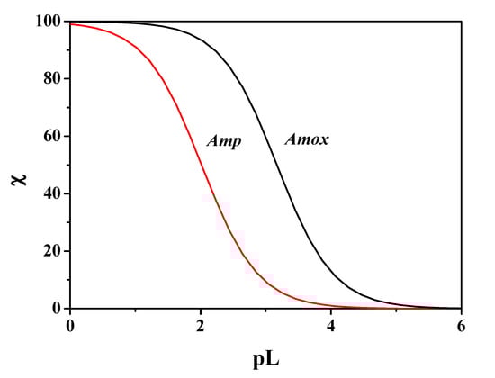 where χ is the sum of the molar fractions of the species and pL represents the cologarithm of the total ligand concentration. In this way, the whole composition of the system is taken into account by pL0.5, as it depends on the system conditions (e.g., pH, temperature, ionic strength), considering all competitive reactions of the metal cation and the ligand. Moreover, in the calculation of the sequestering capacity a concentration of metal cation in traces was considered, making this parameter closer to the concentration conditions of many metal cations in real systems, such as body fluids. Under physiological conditions (pH = 7.4, t = 37 °C, I = 0.15 mol L−1), the sequestering ability values calculated against Mn2+ for Amp and Amox resulted in pL0.5 = 2.01, 3.17, respectively. It emerges that under physiological conditions the binding capacity of Amox is more than one logarithmic unit compared to Amp. These results are comparable with those obtained with another divalent cation, Ca2+, under the same conditions, pL0.5 = 1.82, 2.88 for Amp and Amox, respectively [22]. Another comparison can be made with Zn2+, in this case in the same conditions the sequestering ability is comparable for Amox, while for Amp it is significantly different. More in detail, pL0.5 = 3.16, 2.88 for Amp and Amox, respectively, towards Zn2+ [19]. The sequestering ability values of Amp and Amox towards Mn2+ were calculated under different conditions of pH, temperature and ionic strength. These values are listed in Table 5. Figure 11 shows the comparison of the sequestering capacity of the two ligands towards Mn2+ under physiological conditions. Binding ability of Amox is significantly higher than Amp under these conditions.