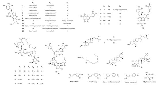 - Otsuka, H.; Kubo, N.; Yamasaki, K.; Padolina, W.G. Two iridoid glycoside caffeoyl esters from Premna odorata. Phytochemistry 1989, 28, 513–515. [Google Scholar] [CrossRef]