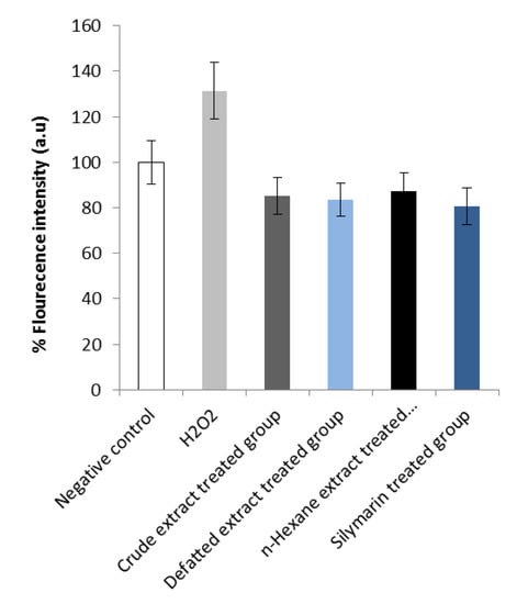 ROS inhibition activities of crude, defatted crude, and n-hex Premna odorata extracts were tested against the Hep G2 human liver cancer cell line using the ROS flow cytometry assay [56]. In brief, the cells were placed in a 96-well microtiter plate at a density of 1 × 104 cells per well in a final volume of 100 μL of the culture medium. These cells were treated for 24 h with different Premna odorata extracts (groups 3–5) and silymarin (group 6) using 10 µL at 37 °C with 5% CO2. After the treatment, the cells were immediately incubated for 24 h at 37 °C [56]. The different groups were then treated with 10 mM 2’,7’-dichlorodihydrofluorescein diacetate (H2DCF–DA) dissolved in the phosphate buffer saline (PBS) (5.0 mg/mL) at 37 °C for 20 min. The color reaction was stopped by removing the media and adding 100 μL DMSO in each well to dissolve the formed formazan crystals. The incubation at 37 °C resumed for up to 20 min to ensure complete dissolution of crystals. The absorbance was determined at λ495 nm using an FLX800 fluorescence microplate reader (BioTEK Instruments, Winooski, VT, USA). H2O2 was used as the positive control.