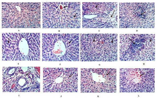 Histopathological results of the activity for Premna odorata extracts (crude, defatted, and n-hexane) and silymarin in alcohol-inflamed liver female Wistar albino rats using a dose of 500 and 200 mg/kg b.w., respectively (H and E X 400). (A) The liver of a rat from group 1 (negative control) showing the negative histological structure of a hepatic lobule. (B) The liver of a rat from group 2 (positive control) showing congestion of the central vein and hepatic sinusoids. (C) The liver of a rat from group 2 showing cytoplasmic vacuolization of hepatocytes and a portal edema. (D) The liver of a rat from group 2 showing focal hepatic necrosis associated with inflammatory cell infiltration. (E) The liver of a rat from group 3 (crude extract-treated group) showing necrosis of sporadic hepatocytes. (F) The liver of a rat from group 3 showing slight congestion of hepatic sinusoids. (G) The liver of a rat from group 4 (defatted extract-treated group) showing slightly hydropic degeneration of hepatocytes. (H) The liver of a rat from group 4 showing hydropic degeneration of hepatocytes and focal hepatic necrosis associated with inflammatory cell infiltration. (I) The liver of a rat from group 5 (n-hexane-treated group) showing a slightly portal edema. (J) The liver of a rat from group 5 showing slightly hydropic degeneration of hepatocytes. (K) The liver of a rat from group 6 (silymarin-treated group) showing slightly hydropic degeneration of hepatocytes. (L) The liver of a rat from group 6 showing slightly focal hepatic hemorrhage.
