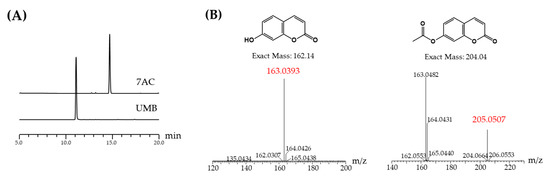 In this study, a hydrogen atom of UMB was substituted by an acetyl group through acetylation. The reaction products were detected and analyzed by HPLC (Figure 1A). The acetylation reaction was examined by electrospray ionization mass spectrometry (ESI/MS) and the resulting 7AC was purified by preparative HPLC.