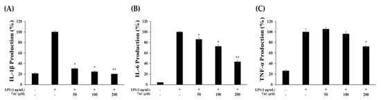 Effect of 7AC on (A) TNF-α, (B) IL-1β and (C) IL-6 production in LPS -stimulated RAW 264.7 cells. Cells were stimulated with 1 µg/mL of LPS only or with LPS along with varying concentrations (50, 100 and 200 µM) of 7AC for 24 h. Their production was determined by ELISA. The data represent the mean ± SD of triplicate experiments. * p < 0.05, ** p < 0.01 versus LPS alone.
