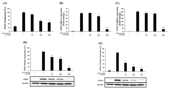 RAW 264.7 macrophage cells were treated with various concentrations of 7AC (50, 100 and 200 µM) with or without LPS (1 µg/mL) for 24 h and the results reveal that the production of PGE2 was inhibited by 10%, 45% and 53%, respectively (Figure 4A). Next, to determine whether the inhibitory effect of 7AC on NO and PGE2 production was due to the suppression of iNOS and COX-2 expression, the protein and mRNA expression of these enzymes were measured. The 7AC significantly inhibited the expression of iNOS at the treated concentrations from 50 to 200 µM (Figure 4B,D) and that of COX-2 at concentrations from 50 to 200 µM (Figure 4C,E) relative to the group treated with LPS only in a dose-dependent manner. These results, therefore, indicate that the reduction of iNOS and COX-2 is key to the decreased expression of NO and PGE2.