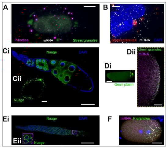 Research of the past few decades uncovered a variety of RNA granules. Some, such as Processing bodies (P-bodies) and stress granules (Figure 1A,B) are wide spread, while others such as germ granules (Figure 1C–F) are highly specialized and form only in a subset of cells. Given that they enrich mRNAs, RNA granules have been mainly associated with post-transcriptional regulation. Increasing evidence suggests that these condensates appear at the center of diverse biological processes and are even associated with various human diseases (reviewed in []). For example, P-body homeostasis appears to regulate stem cell potency by alternating the chromatin structure of these cells []. In addition, P-bodies are involved in post-transcriptional regulation of the huntingtin protein in Huntington’s disease []. Stress granules have been found to promote cancer cell survival (reviewed in []) and may also regulate viral replication upon infection (reviewed in []). In Drosophila melanogaster, mutations in germ granule components induce sterility of the progeny (reviewed in []) whereas mutations of P granule components in Caenorhabditis elegans induce piRNA-initiated transgenerational silencing of genes involved in RNA interference []. Several features are conserved among diverse RNA granules, including their morphology, how they form, and what protein families enrich in them. Despite these similarities RNA granules have distinct biological roles. Studying different RNA granules therefore not only deepens our understanding of these condensates but also provides fundamental new insights into human disease.