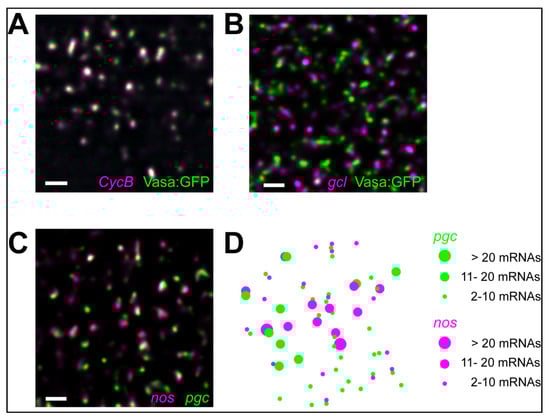 (A,B) CycB and gcl mRNA clusters (magenta; hybridized with smFISH probes) occupy distinct positions within Drosophila germ granules (green, labeled by Vasa fused with GFP). (C,D) Homotypic clusters contain multiple nos or pgc mRNAs (magenta and green, respectively hybridized with smFISH probes), do not have a defined stoichiometry and de-mix from each other within the same granule []. Scale bar in all is 1 µm.
