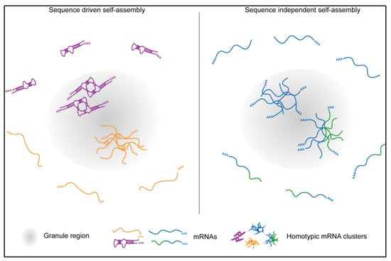 Proposed models showing the mechanisms of mRNA self-organization in RNA granules using sequence-dependent or sequence-independent assembly. The later mechanism was demonstrated for homotypic mRNA clusters in Drosophila germ granules. Here, mRNAs distinguish between endogenous mRNAs and its derivatives and de-mix to form distinct homotypic clusters [].