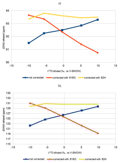 The (D/H)I and (D/H)II values of ethanol, corrected using Equation (6) in Equations (1) and (2), are not significantly different from those obtained using Equation (5) in Equations (1) and (2) for values of δ18O of water of the sugar solution ranging between −10 and −5 ‰ and from those of uncorrected values for δ18O of water higher than +5 ‰.