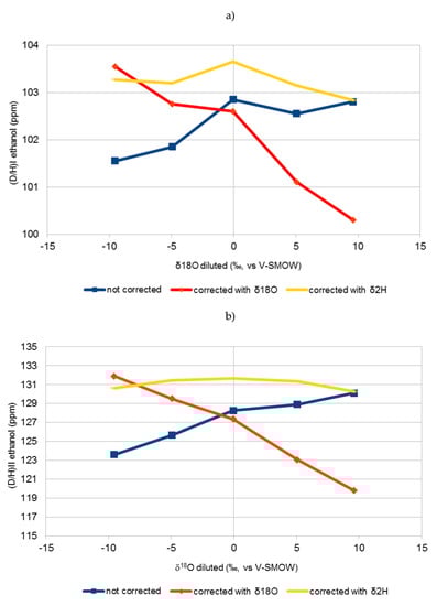 Figure 1, Figure 2 and Figure 3 show the variation of the uncorrected and corrected (D/H)I (a) and (D/H)II (b) values of ethanol with δ18O values of water of diluted sugar samples. Equations (1) and (2) was used for correction purposes taking into account, for calculation of , both δ18O (Equation (5)) and δ2H (Equation (6)).