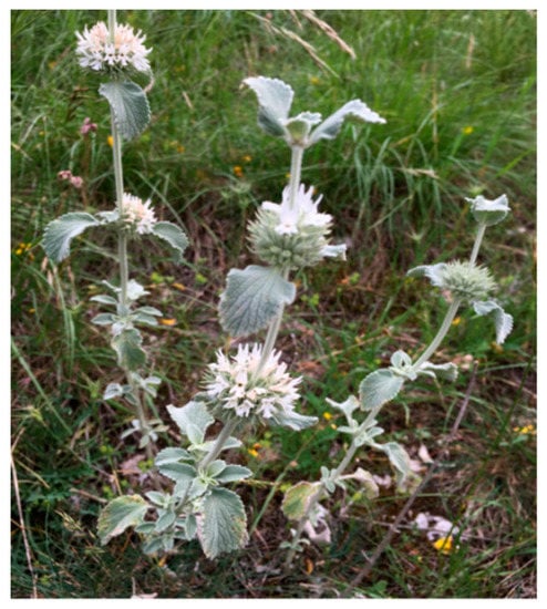 Belonging to the Lamiaceae family and better known by the common name of white horehound, Marrubium incanum Desr. (Figure 1) is a small perennial herbaceous plant native to the Eastern Mediterranean Basin, especially Italy and the Balkan area. The name of the species refers to the presence of thick white hairiness covering the stems and leaves. The plant usually grows on arid and rocky lands up to the altitude of 1200 m a.s.l. []. From a botanical point of view, this species is characterized by buds at the ground level and by one stretched floral axis, generally leafless. The plant is endowed with rhizomes, while the erected stem presents a quadrangular section; the leaves are typically opposite and petiolate, and the inflorescences develop as multiple thyrsoid verticillasters intertwined along the stem, with hermaphrodite flowers and a fused corolla; the fruit is a very small schizocarp composed of four nutlets [].