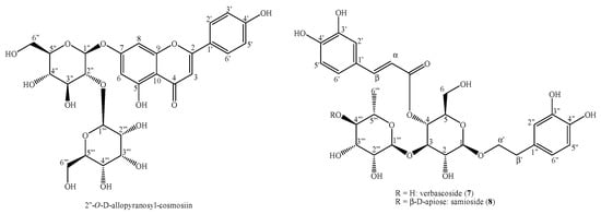 As far as other secondary metabolites are concerned, 2″-O-allopyranosyl-cosmosiin (6) and samioside (8) have been previously isolated from other species. In particular, compound (6), which is a derivative of apigenin with two saccharide residues, has been detected in the Lamiaceae family only in the genus Sideritis L. [,] and in other families such as Taxaceae [], Caprifoliaceae [], and Leguminosae []. Compound (8), which is a derivative of verbascoside with a further saccharidic residue (β-D-apiose), has been evidenced in the Lamiaceae family in the genus Phlomis L. [] and in Teucrium chamaedrys L. [], as well as in other families such as Orobanchaceae [] and Verbenaceae []. On the above, also these compounds cannot be used as chemotaxonomic markers of M. incanum.