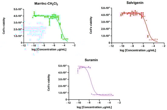 Growth inhibition of T. b. bruceiTC221 cells induced by Marrinc-CH2Cl2 (green), salvigenin (red), and suramin (purple). The graphs show the average results from eightindependent experiments with standard errors.