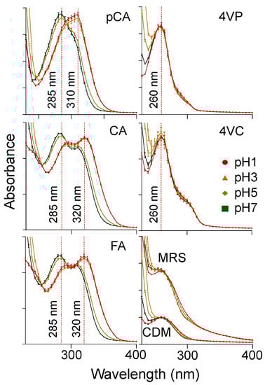 3.5. Rapid, High-Throughput Screening of Hydroxycinnamic acid Degradation by LAB Using UV-Vis Spectroscopy and Selection of Optimal pH for Measurement