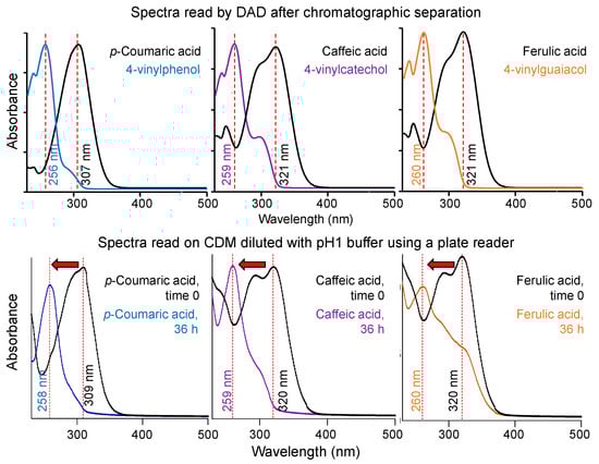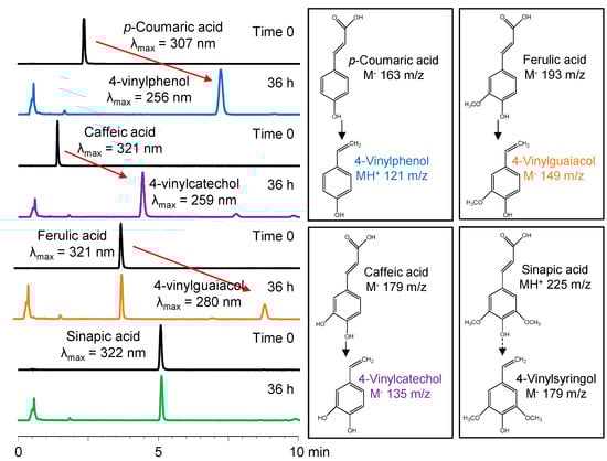 Miyagusuku-Cruzado, G.; García-Cano, I.; Rocha-Mendoza, D.; Jiménez-Flores, R.; Giusti, M.M. Monitoring Hydroxycinnamic Acid Decarboxylation by Lactic Acid Bacteria Using High-Throughput UV-Vis Spectroscopy. Molecules 2020, 25, 3142. https://doi.org/10.3390/molecules25143142