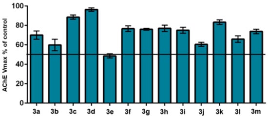 Initially, all compounds were screened at a standard screening concentration of 30 μM and the resulting percentages of AChE inhibition by the triazole derivatives 3a–m are shown in Figure 3. Compound 3e was identified as the most active in the series, inhibiting more than 50% of the AChE activity at the screening concentration and exhibiting an IC50 value of 26.30 μM, being more potent than curcumin (IC50= 132.13 μM [26]), but less potent than donepezil (IC50= 0.026 μM [26]). A study was also performed to verify the ability of 3e to inhibit BuChE, but no relevant activity was detected, being selective against AChE.